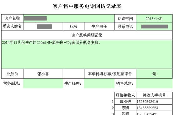 4、售中电话回访记录表,根据反映问题,确认短信通知客服组员,实现问题即时全面解决。
