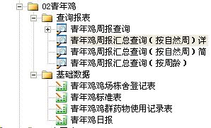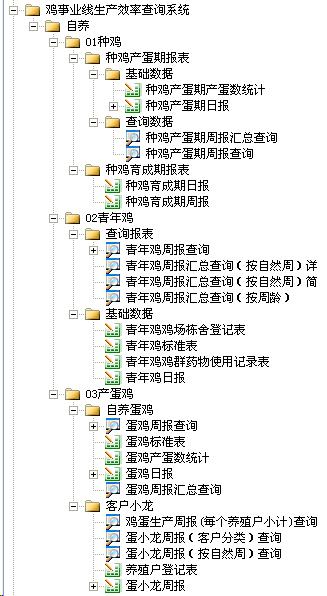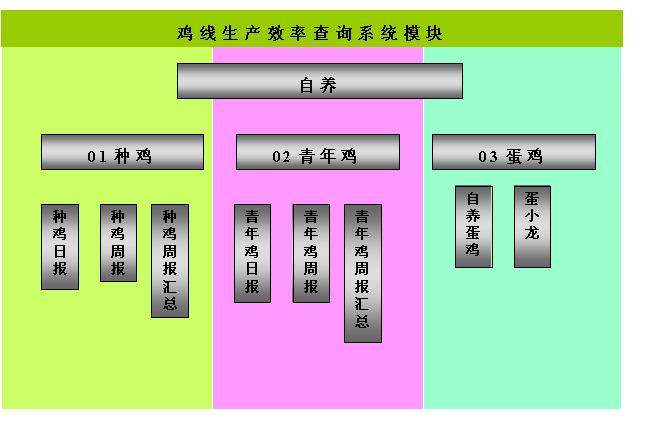 生产效率查询系统分为三大模块:01种鸡、02青年鸡、03蛋鸡。用户填报各类鸡的日报后查询者便可查询相关的周报和周报汇总。