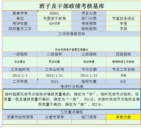 1)被考评单位填报指标。年初我们将市直各部门全年绩效考核工作任务指标统一录入到系统中,然后每个月各被考评单位按照节点日期完成填报工作。