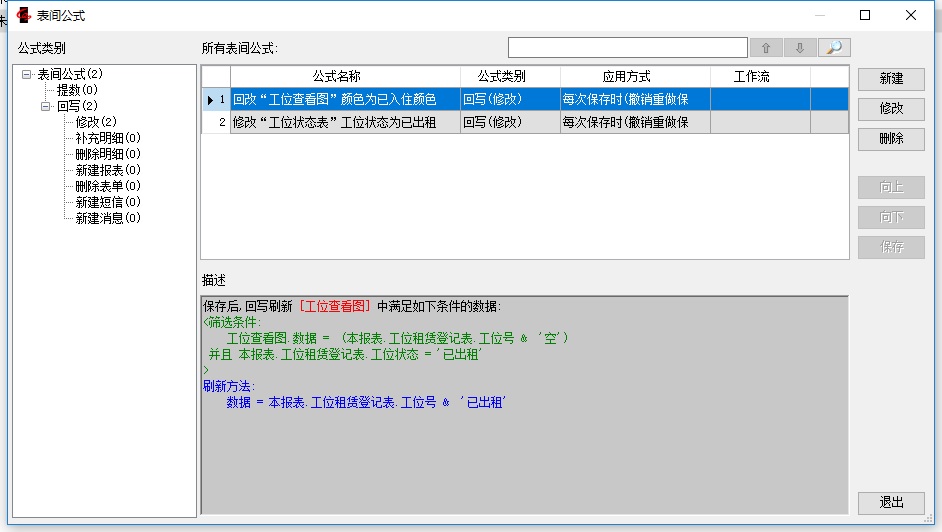 从状态表中选取“空”工位,录入相关信息;保存后,修改“工位状态表”中此工位状态为“空”,修改“工位查看表”中工位号为“工位号&已出租”(前期定义单元格规则:包含:”空“为某个颜色,包含“已出租”为某个颜色)