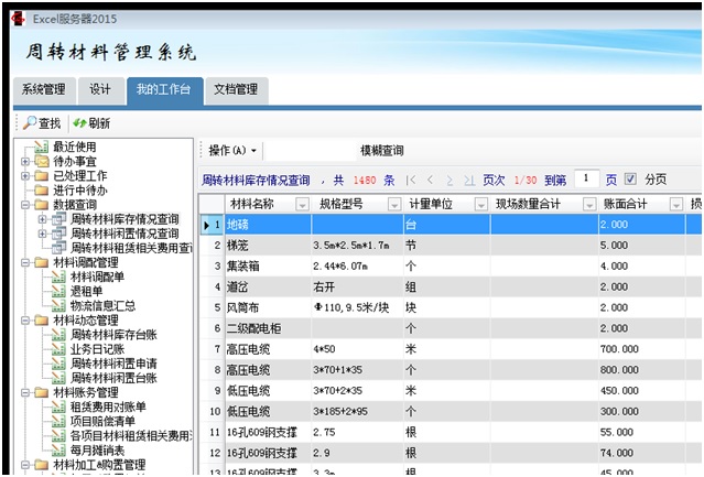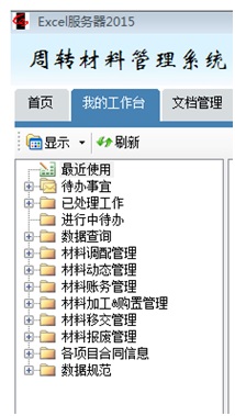 为解决上述问题,本人在勤哲刘老师的帮助下,在Excel服务器软件平台上搭建了“周转材料信息管理系统”,本系统具有如下功能模块: