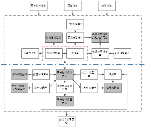 如图所示,箭头方向表示数据流程方向。周转材料信息、项目信息、赔偿标准是本系统功能的基础数据,统一了各类模板的数据信息;材料调配单、退租单是最基本的业务单据;灰色底色模板是各类台账,需要提前建立“空台账”,用以接收相关原始表单数据。