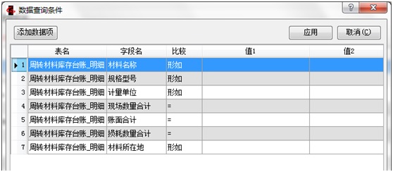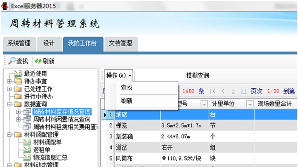 数据查询模块:可以根据需要设置各类信息的快速查询,暂时只设置了周转材料库存情况查询、周转材料闲置情况查询和周转材料租赁相关费用查询。
