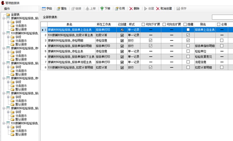 本表设置了8个数据表:5个单一主表,3个明细表。表中字段应用了链接、附件盒子等方式。