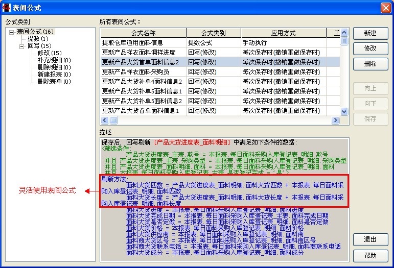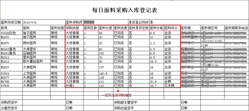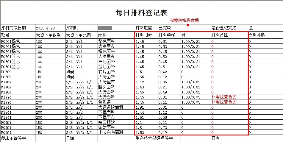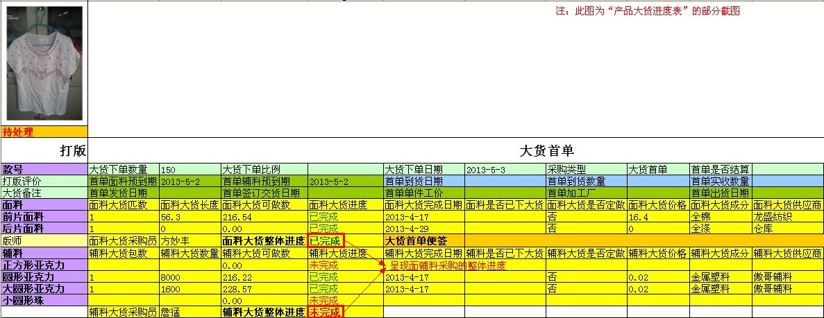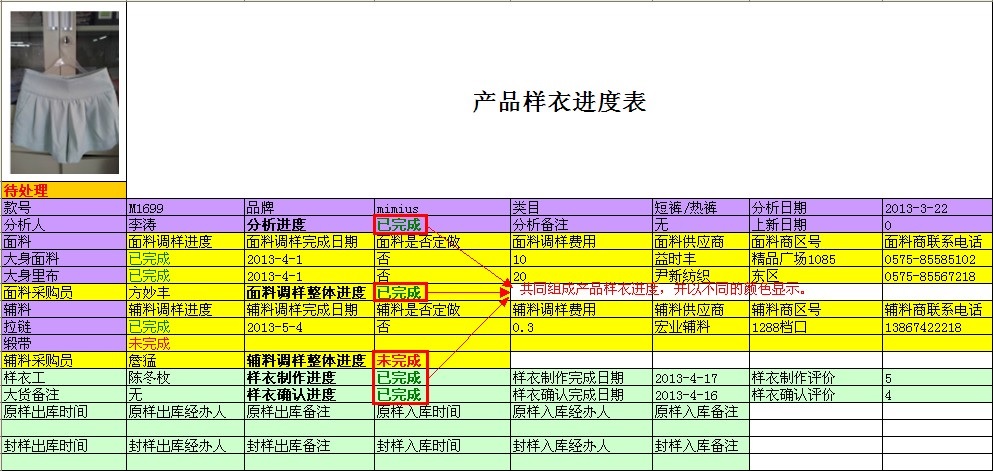 该模板涵盖了产品部所有需进行数据录入的表单,为产品样衣进度和大货进度提供直接的信息来源,通过回写公式完成数据库的更新,也是系统管理员进行系统日常维护的重点。