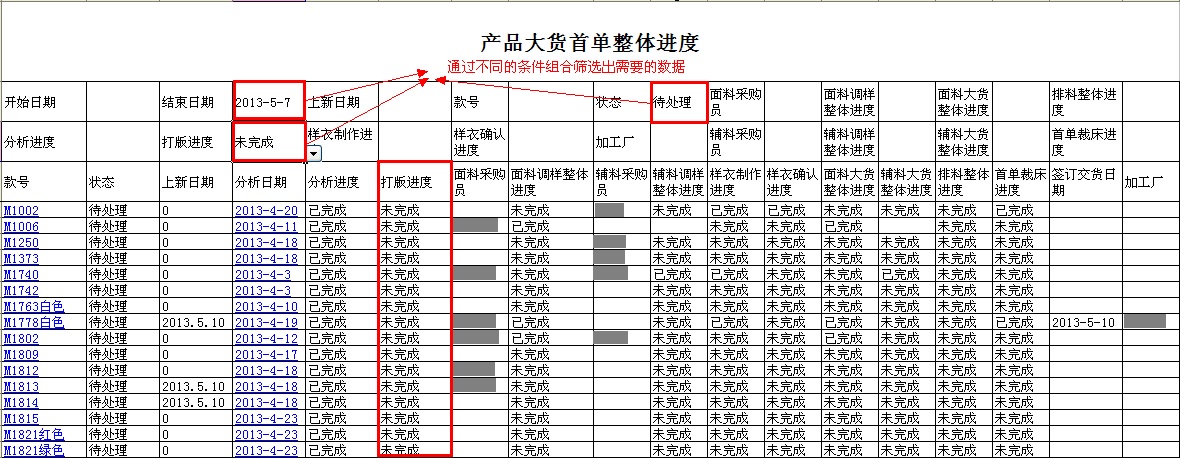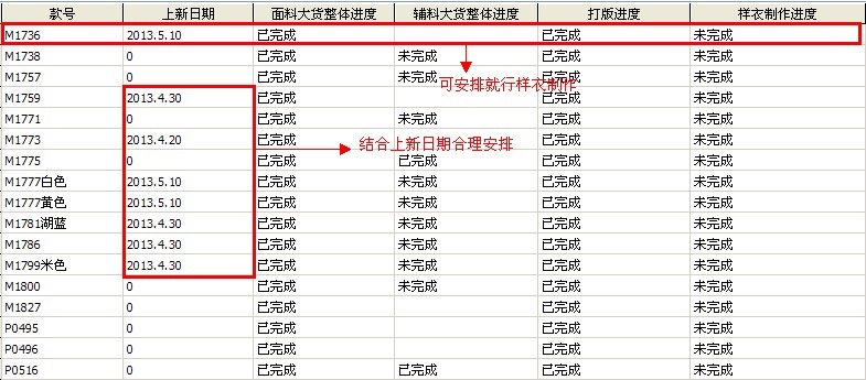 该模块为整个系统的核心,通过数据回写,集合了产品部日常需要的几乎所有信息,其中“产品样衣进度表”主要保存产品样衣的分析、调样、制样以及样衣确认,而“产品大货进度表”则记录了从大货下单到大货补单结束的全过程。