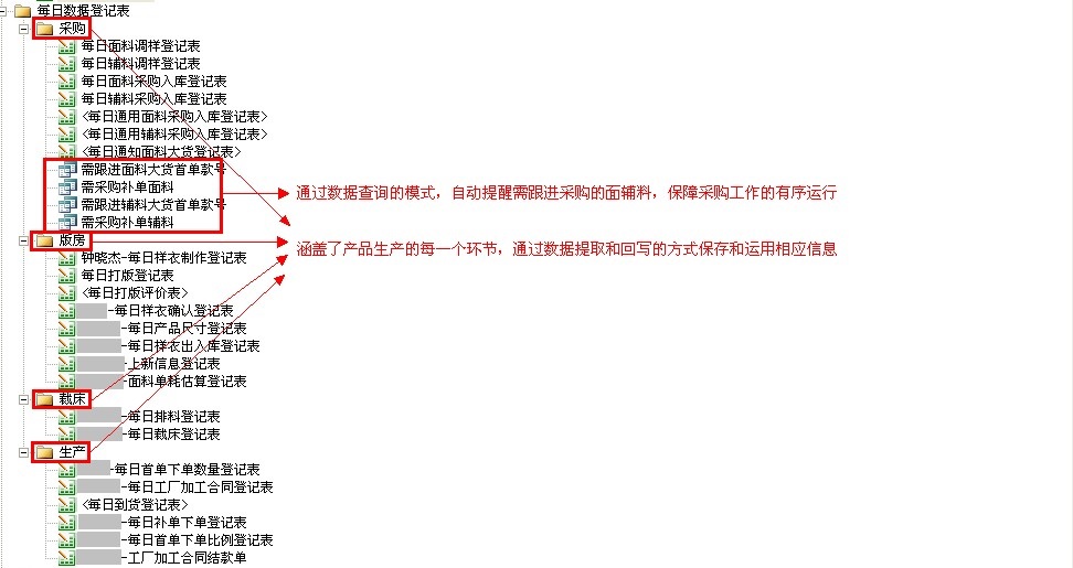 因为勤哲excel服务器是专门为公司产品部量身定制的,因此系统的架构也主要围绕产品生产环节展开,大致分为产品进度、数据登记、数据查询、数据库、资料库5个方面,其中产品进度为系统的核心表单,主要为产品样衣进度以及大货进度,而数据登记则涵盖了几乎所有的生产流程和管理环节,主要包括产品的打版、制样、下单、采购、排料、裁床以及加工。