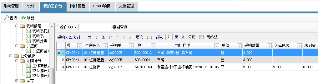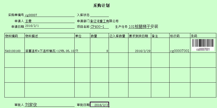 采购订单采用工作流形式,由材料员填报采购计划,主管审核,经理审核:
