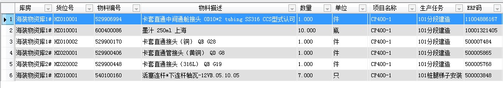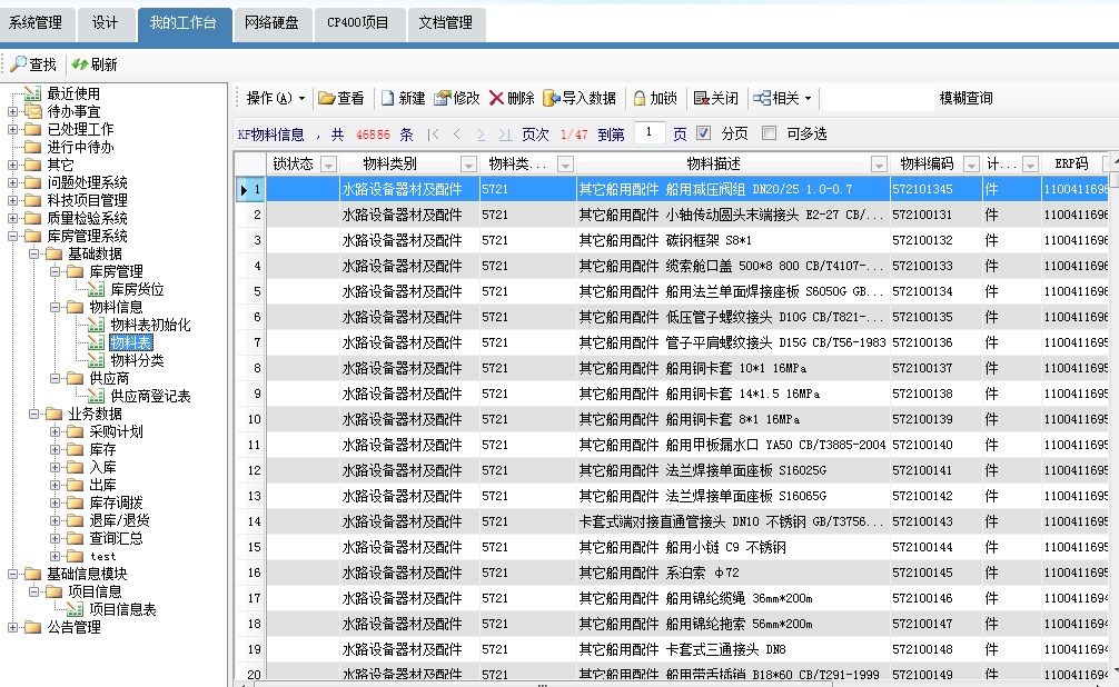 物料表、物料分类、库房货位、供应商登记管理信息。