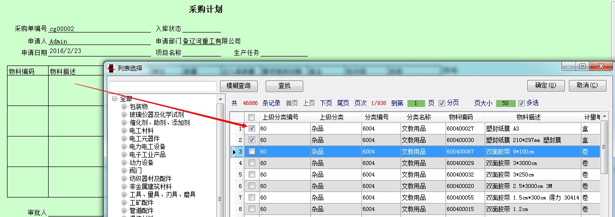 在采购计划中通过点击项目名称,弹出列表项目,选择项目名称和生产任务