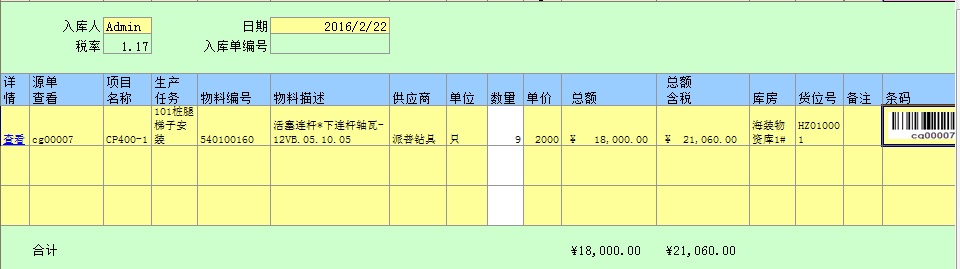 物料到货后,根据采购订单信息,到现场核对,填写入库单,如下图所示: