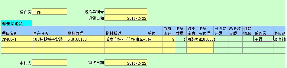 若将物料进行退库操作,则进入退库界面,选择退库物料,填写退库单,如下图: