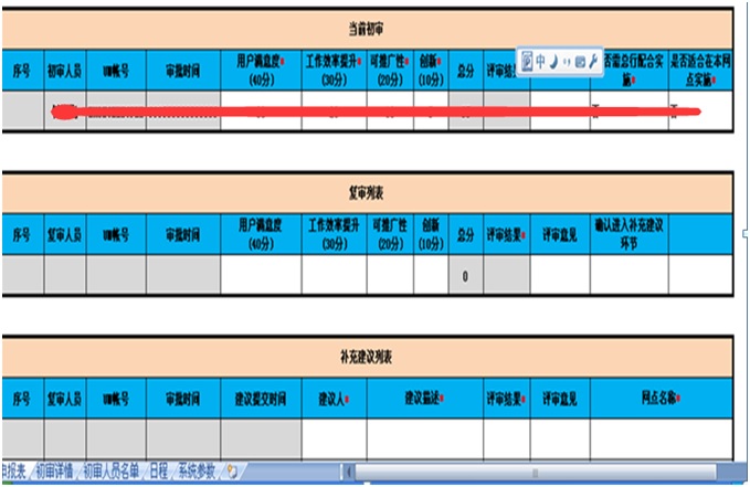 “网点流程优化建议申报表”的业务逻辑通过工作流和表间公式实现各环节的自动流转,初审人员由指定的分行管理人员进行管理设置,初审员对申报项目进行评分,系统根据评分自动判定该项目是否通过审核,当此建议通过数超半数即进入复审,复审员复审通过后,所有运营人员可对此建议进行上报补充建议,补充建议结束后由复审员进行再次审核。