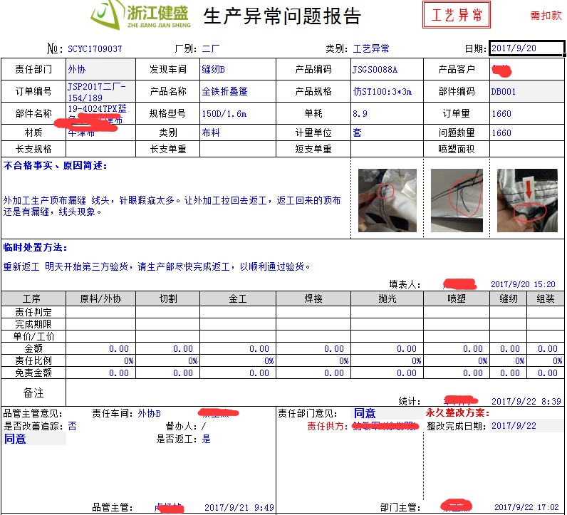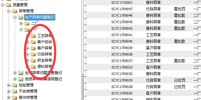 异常管理分工艺异常、客户投诉、客户异常、行政异常、研发异常、原料异常等,其中工艺异常是指在生产过程中因工艺缺陷造成不良品的异常,填报人品管员;原料异常是指在生产过程中因原材料问题而造成不良品的异常,填报人品管员;客户投诉是指售后客户投诉,填报人业务员;行政异常是指车间发生行政类异常,如车间设备人为破坏、禁烟区吃烟等现象,填报人行政人员。