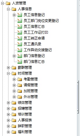 人资管理模块分人事管理、薪酬管理、时间管理、绩效管理、招聘管理、培训管理、辞职管理、福利管理、人事报表等二级模块。