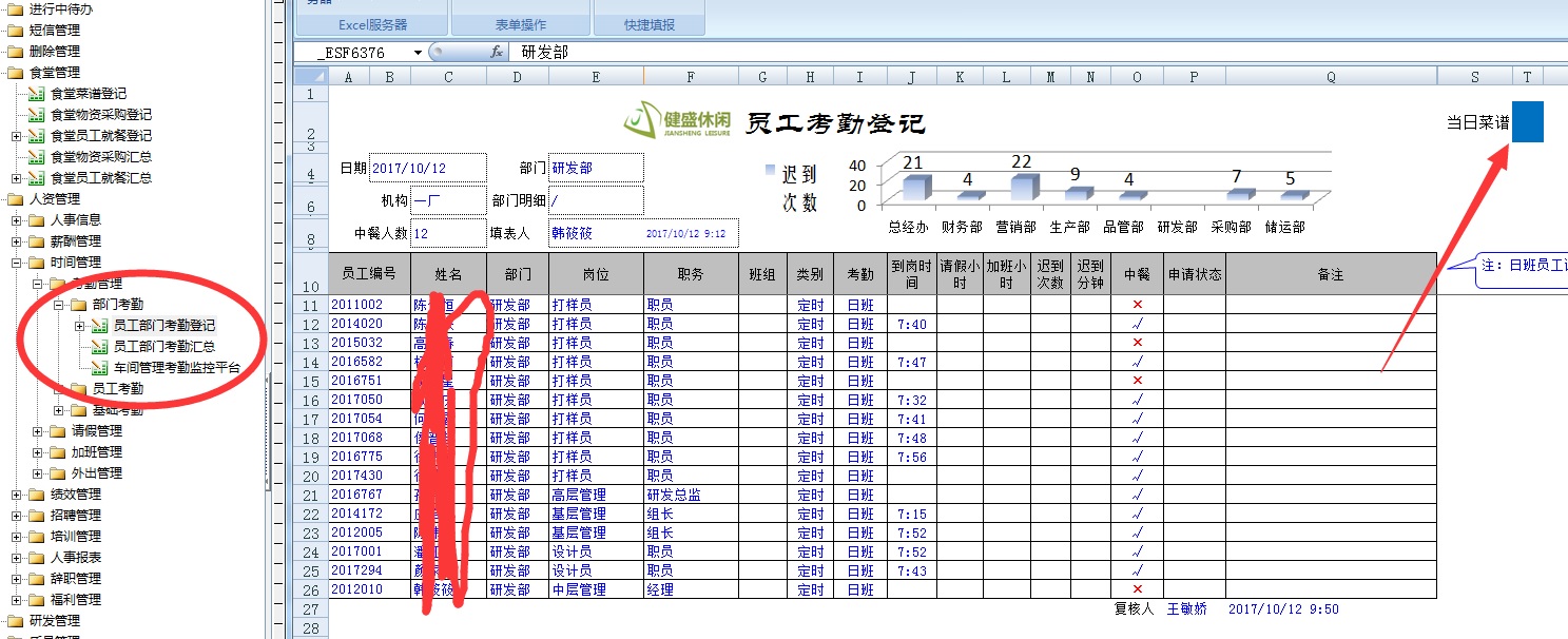 2、部门考勤与食堂管理数据互动,部门考勤员新建表单时,直接可以查看当日食堂菜谱情况,便于办经办汇总计划就餐人数,避免食堂食物浪费。