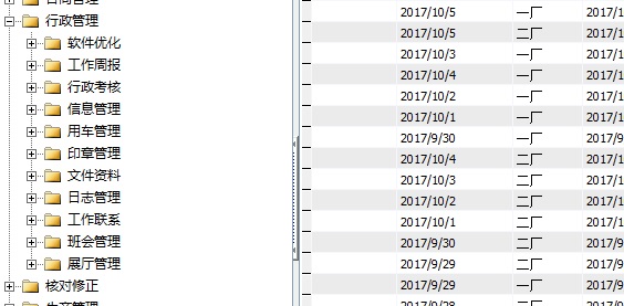 行政管理模块分工作周报、信息管理、用车管理、印章管理、文件资料、日志管理、工作联系、班会管理等二级模块。