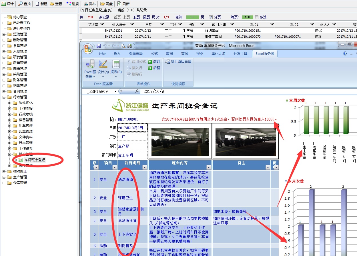 早晚班会由原来现场记录变为系统记录,班会项目可以根据部门不一样而不相同,可以部门定制,同时上传班会照片,班会次数实时汇总,制度规定可对照片。