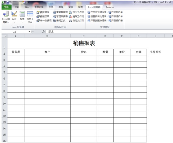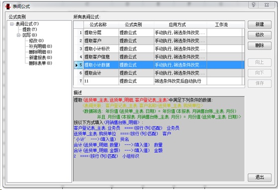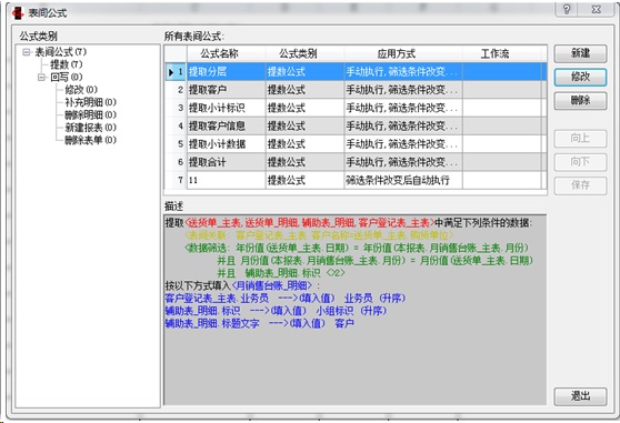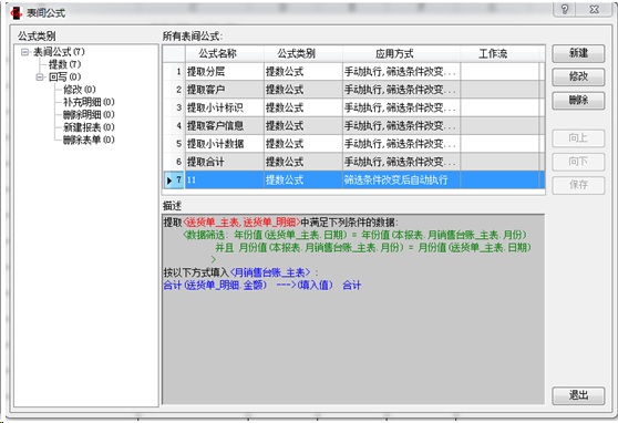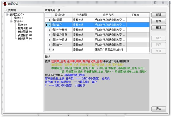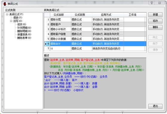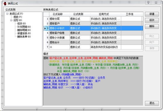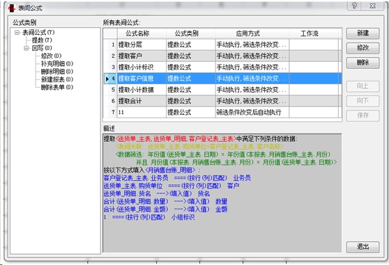 下面举一个销售管理系统中的月销售报表为例,介绍一下设计经验,在空白处画好表格,规定好单一数据项和重复数据项,就到了最主要的表间公式的设计,下图是我们的设计:
