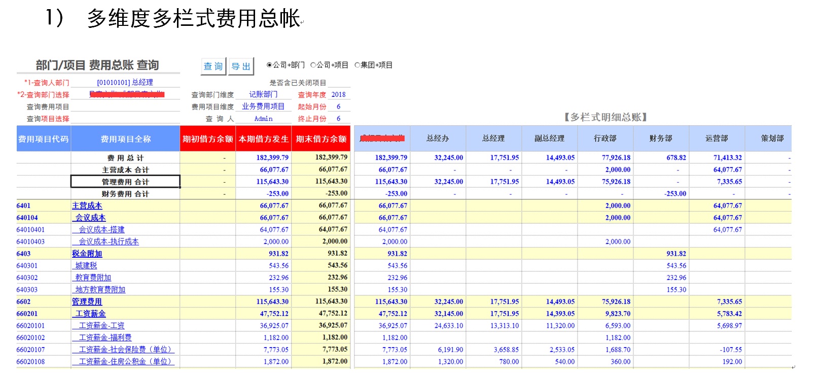 1) 多维度多栏式费用总帐