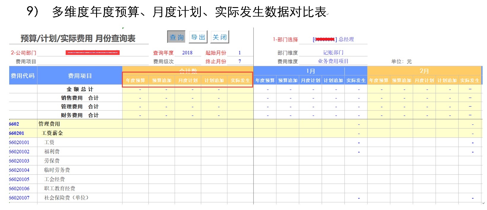 9) 多维度年度预算、月度计划、实际发生数据对比表