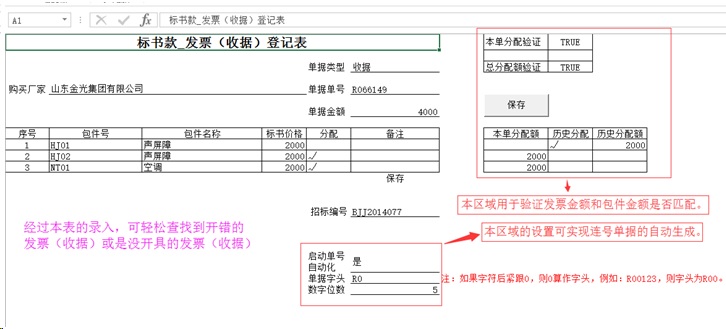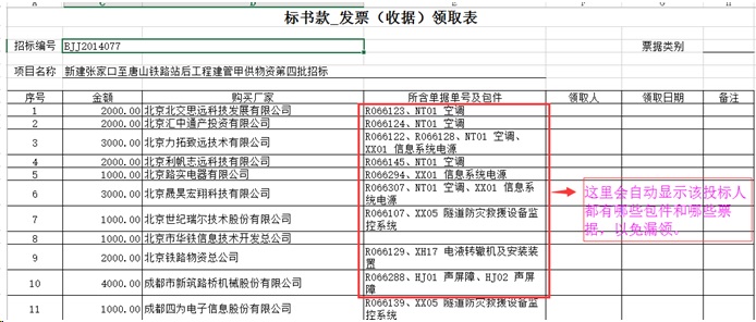 用于记录和分配财务开具的标书款发票或收据(有时候一张发票包含几个包件)