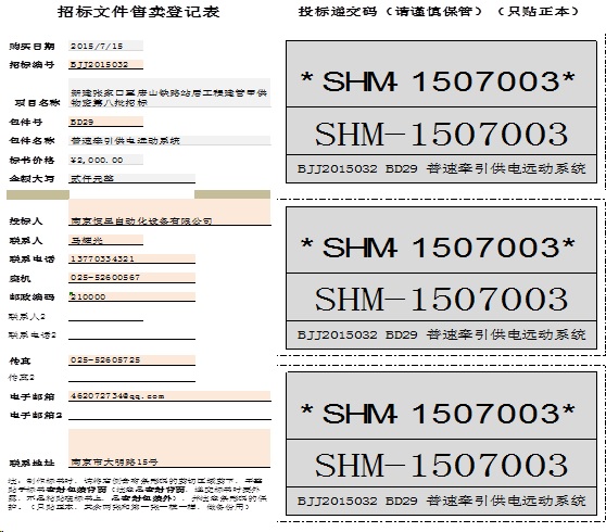 用于标书发售时厂家购买信息的登记,并打印出相关信息和条形码,要求供应商粘贴于标书密封包装外,条形码用于之后的标书递交环节使用扫码枪快递收