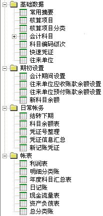 整个系统共分四部分:基础数据、期初设置、日常帐务、帐表。