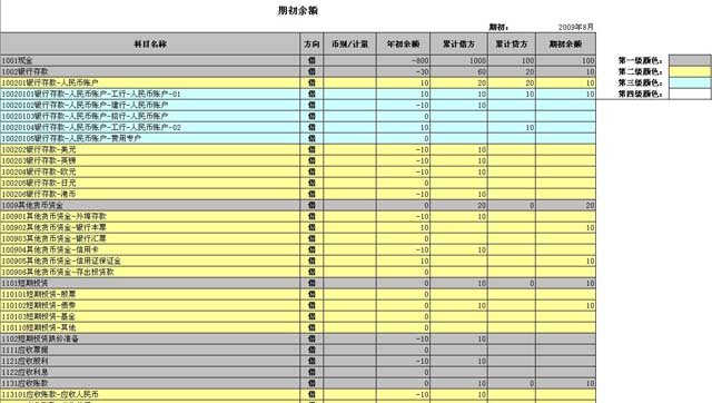 一共分为四层科目,第一层科目颜色为灰色,第二层科目颜色为红色,第三层科目颜色为蓝色,第四层科目颜色为白色;输入底层科目的余额,能自动计算出上层科目的余额。比如:银行存款科目有两个子科目,工行和建行,则,输入工行或建行的科目余额后,能自动计算出银行存款科目的余额是这两个子科目余额的和。
