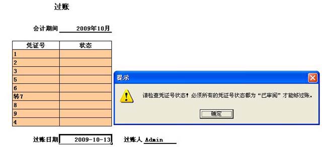 ()过账时,选择一个会计期间,系统会自动提取出该会计期间产生的所有凭证号以及状态,必须所有的凭证号状态都为“已审阅”才能够过账,否则保存不能通过。