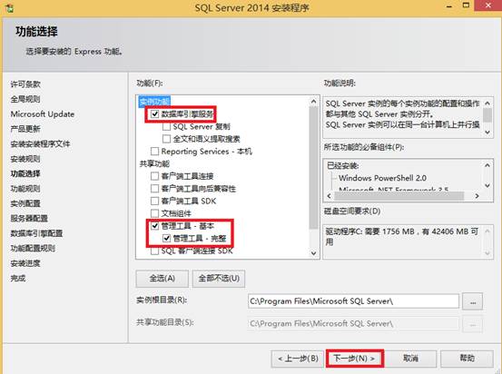- 选择“数据库引擎服务”、“管理工具-基本”、“管理工具-完整”,点击“下一步”: