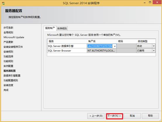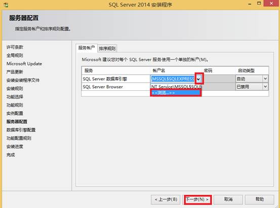 - 选择“SQL Server数据库引擎”的帐户名,点击“浏览”:
