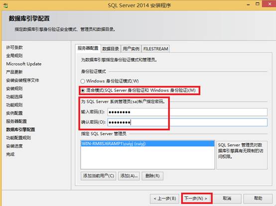 - 选择“混合模式”,输入sa的密码,密码要求包括大小写字母和数字,不少于8位,例如Sa123456。