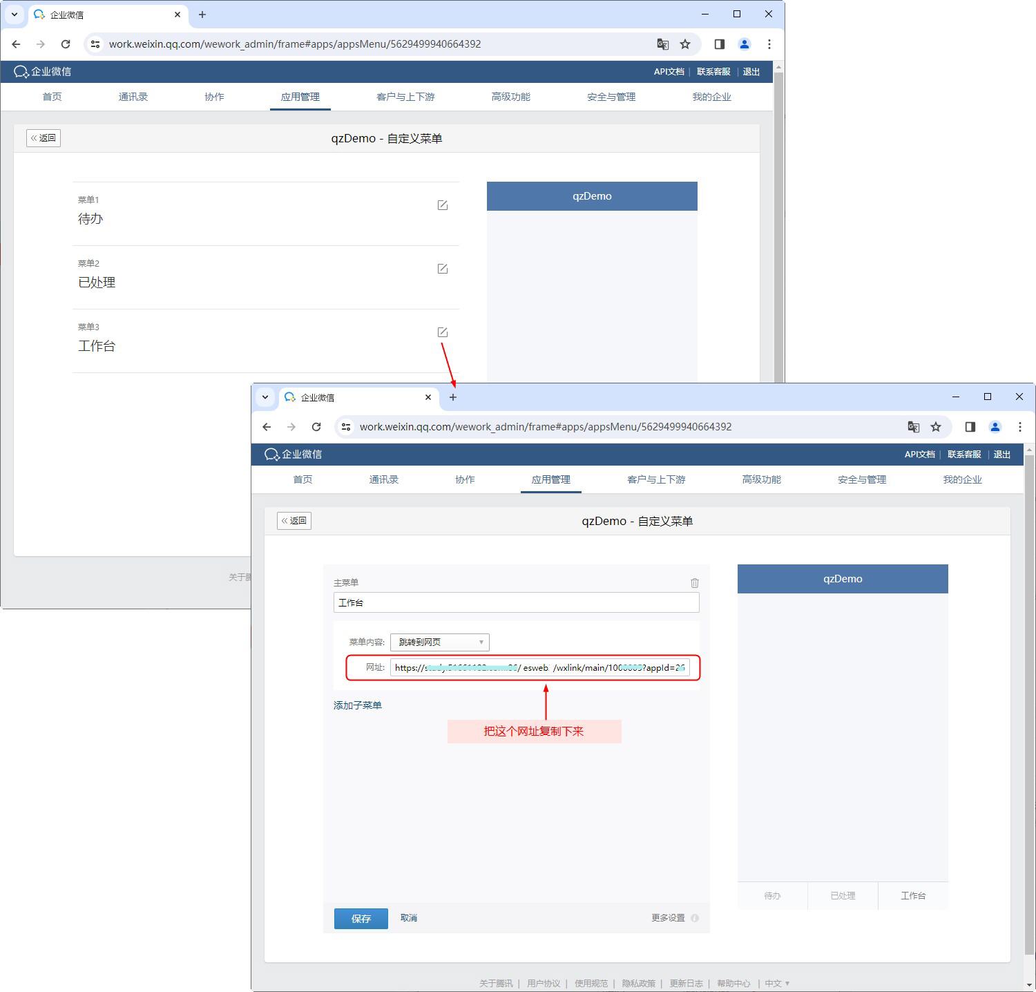 点击自建应用详情页上的【自定义菜单】下面的【已启用】,进入自定义菜单页面,点击【工作台】右侧的编辑图标,显示工作台的详细网址,如下图,把它复制下来。