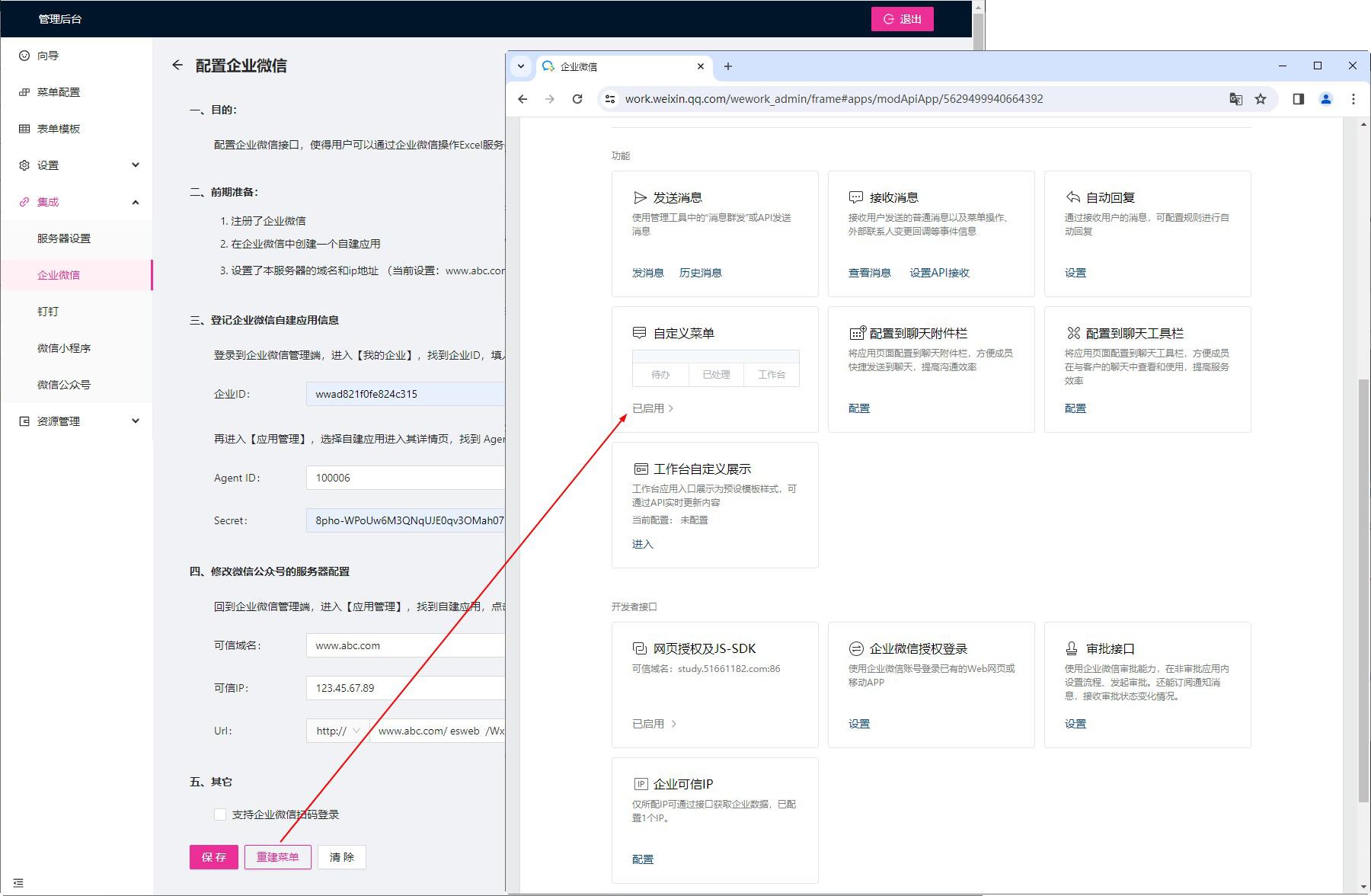 回到Excel服务器移动端设计门户的配置企业微信页面,点击【重建菜单】(注意要先【保存】过),到企业微信自建应用的详情页,我们会看到“自定义菜单”变成了“已启用”