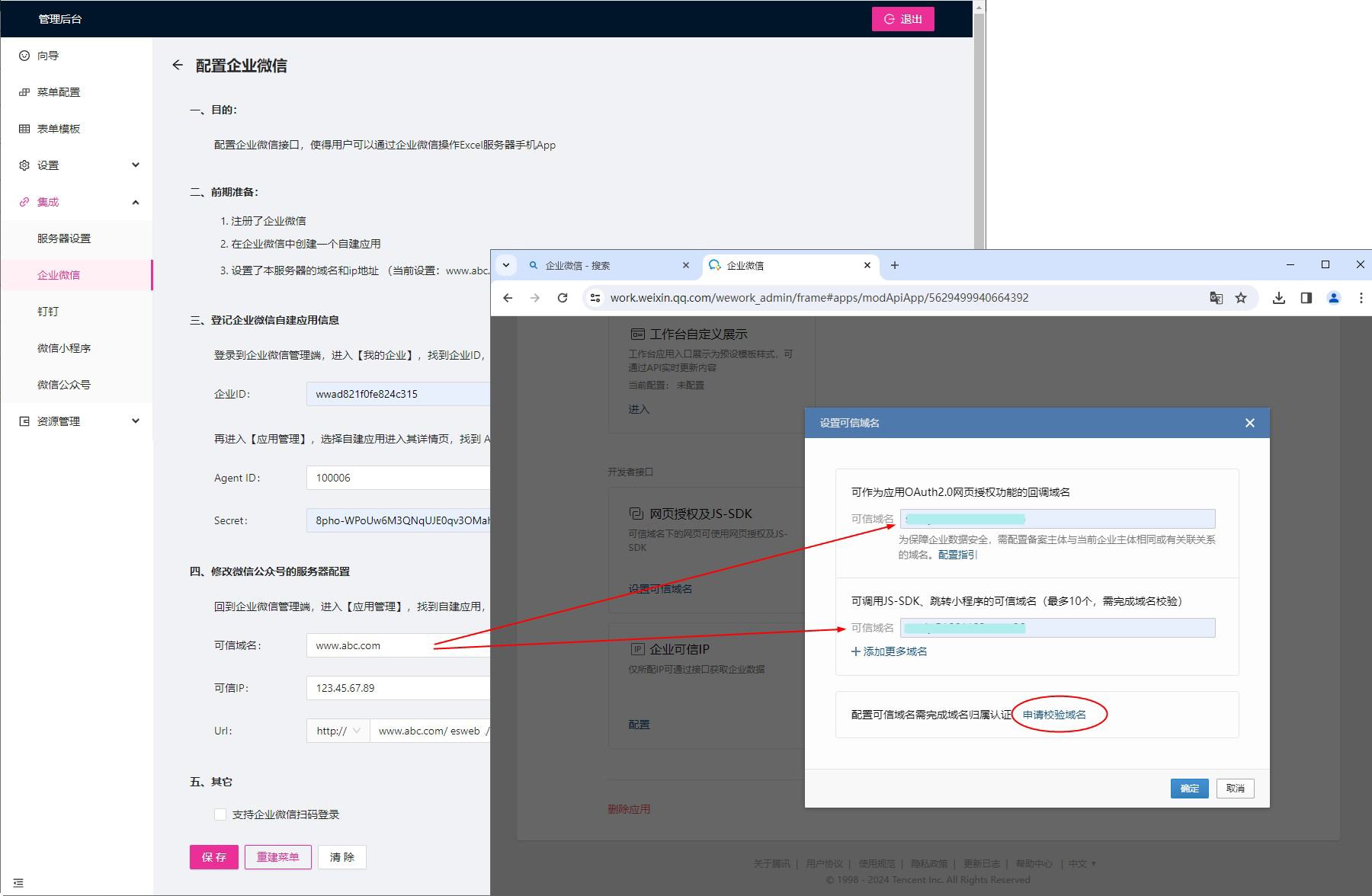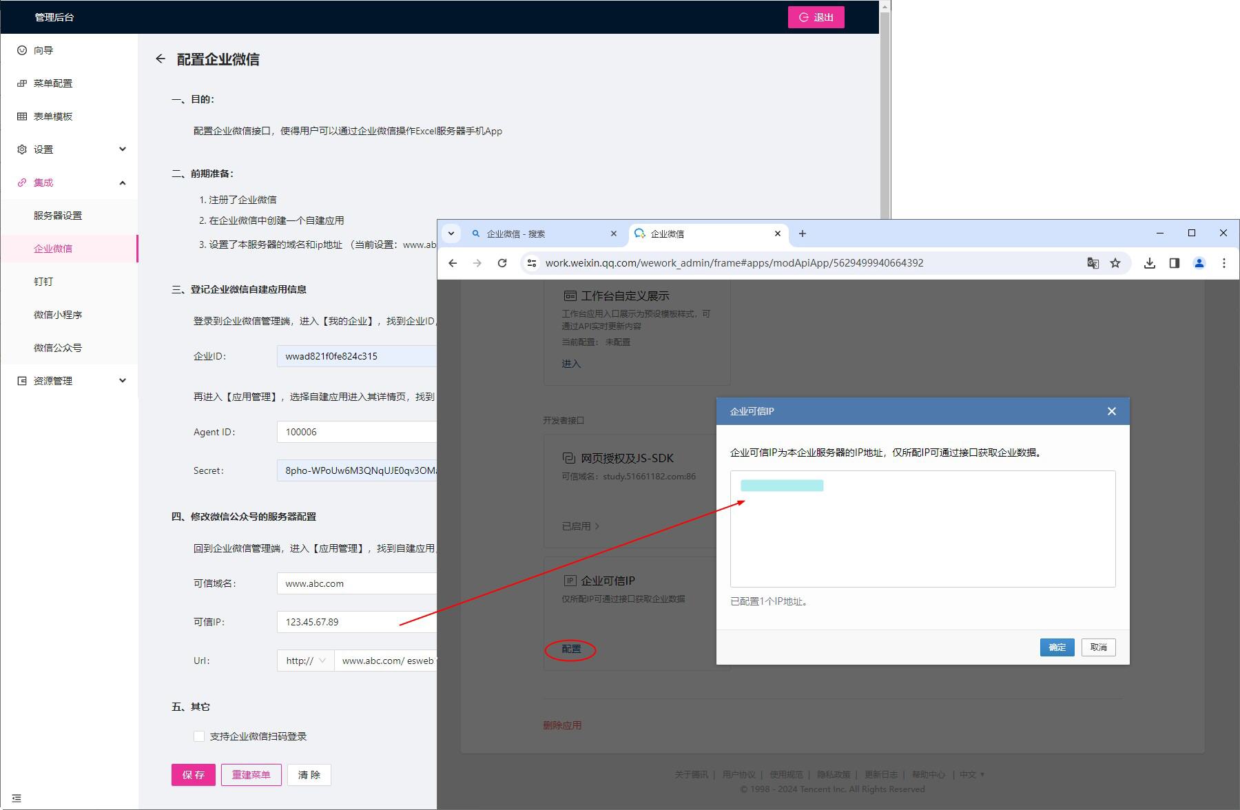 在企业微信自建应用中,我们要登记Excel服务器应用所在的服务器ip地址、域名。