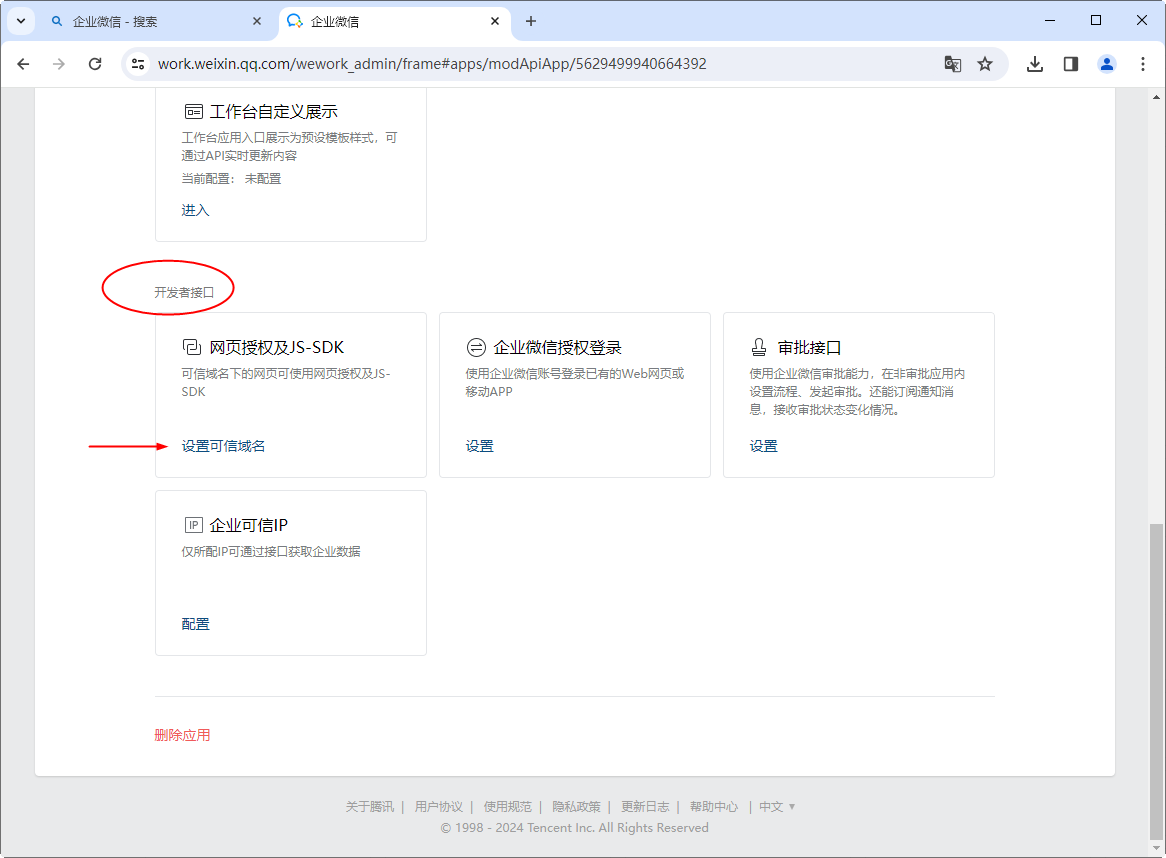 在企业微信管理后台,点击顶端菜单【应用管理】,选择自建应用,进入自建应用的详情页,向下滚动找到“开发者接口”部分,在【网页授权及 JS-SDK】那里,点击【设置可信域名】