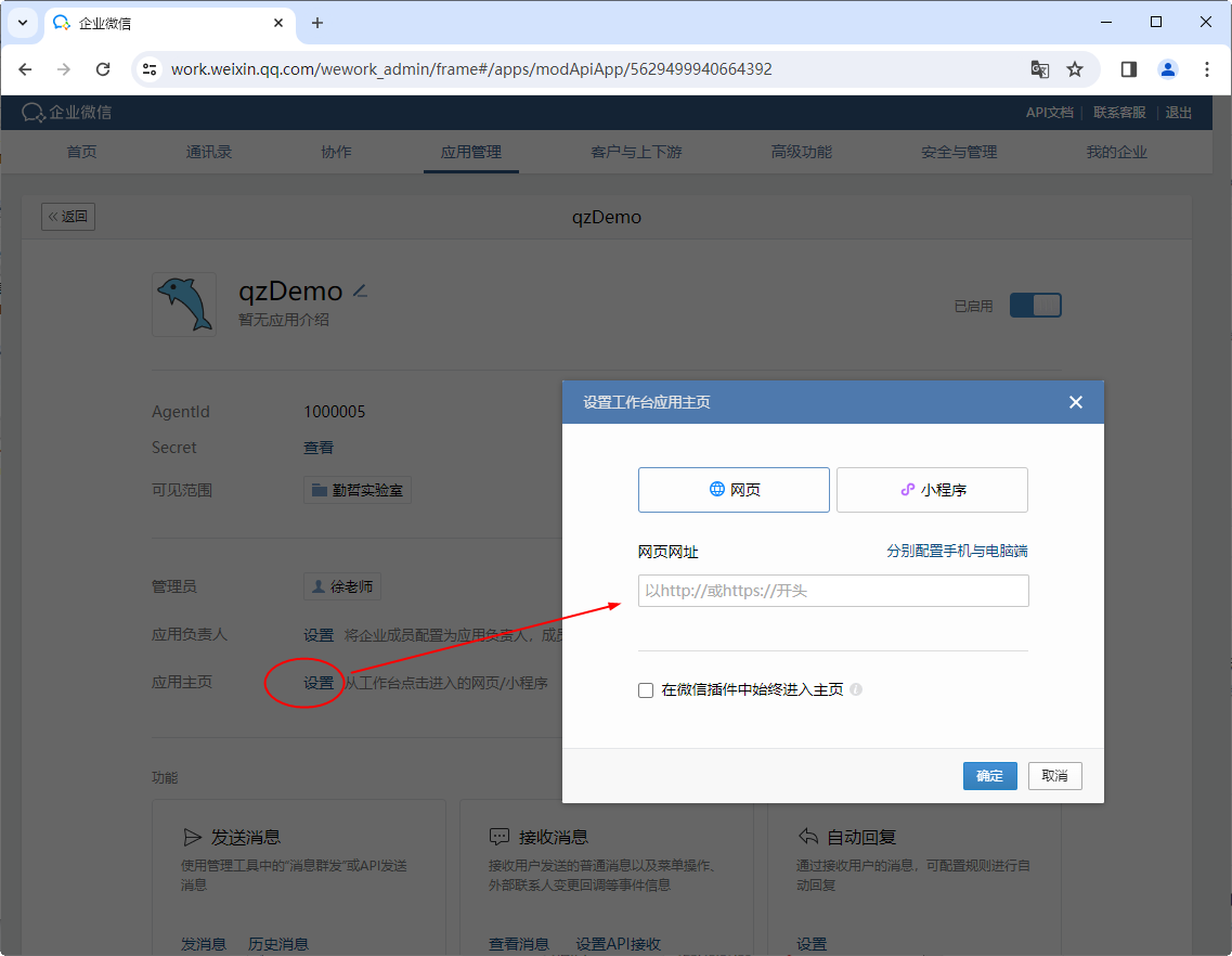 点【取消】-【返回】,回到自建应用详情页,点击“应用主页”旁边的【设置】,弹出“设置工作台应用主页”弹窗,将前面复制下来的工作台菜单网址粘贴到“网页网址”输入框,【确定】。