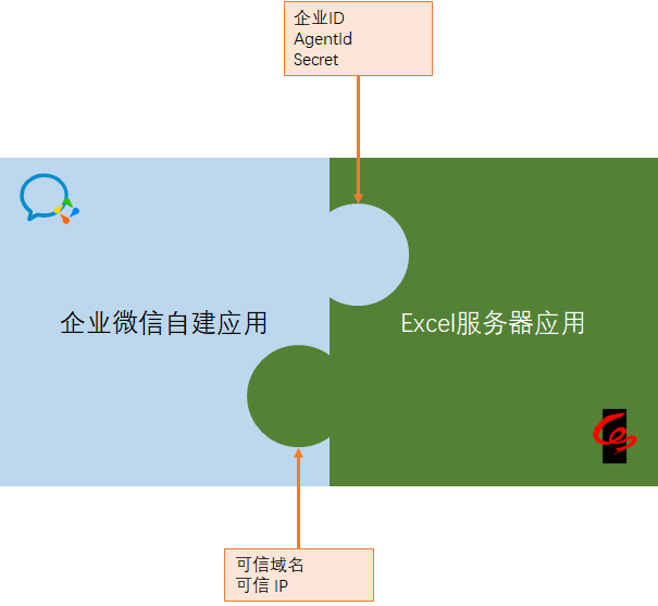 所谓应用对接,即我们要让企业微信自建应用和Excel服务器应用互相能找到对方,如下图所示。