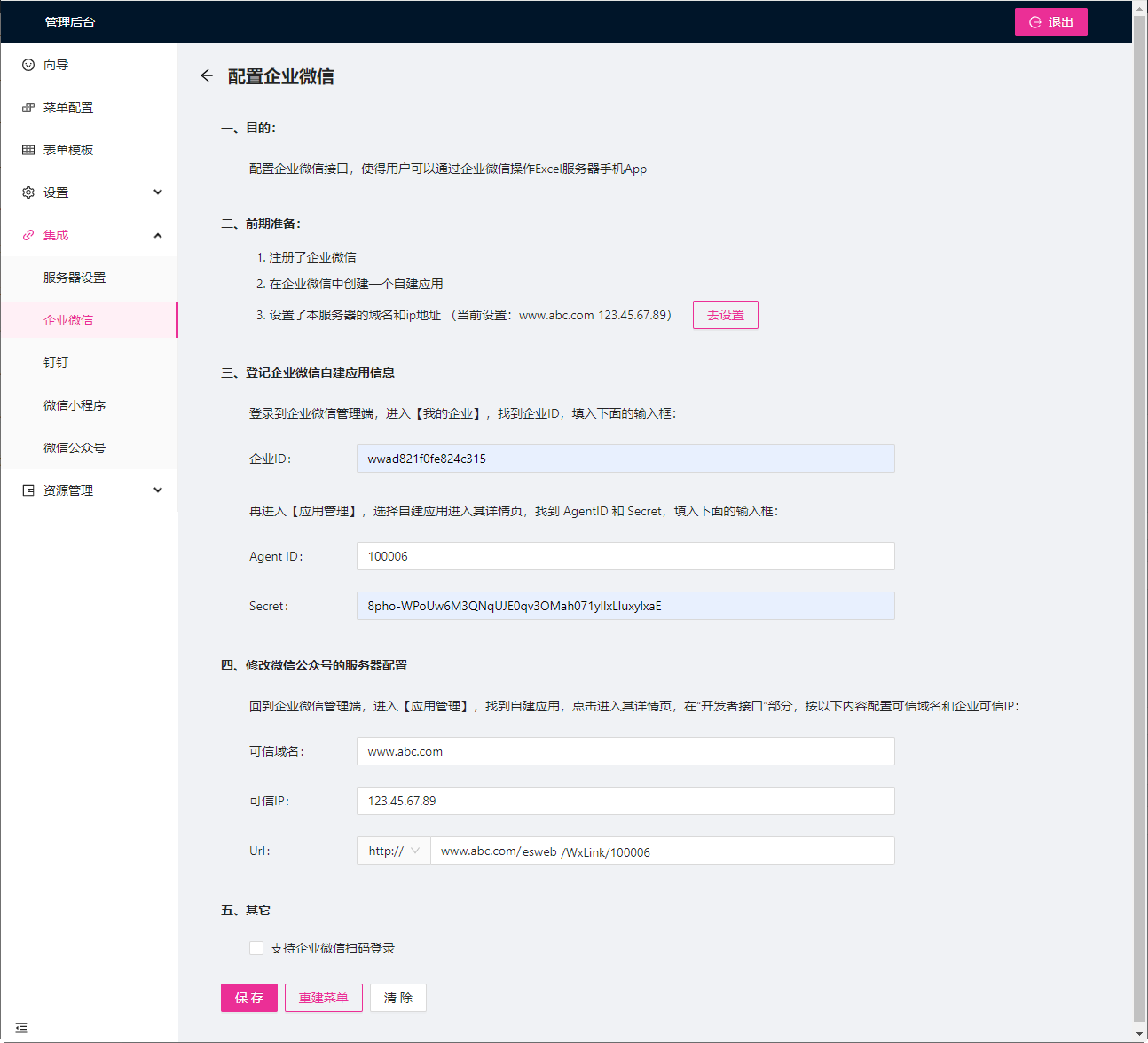 以管理员身份登录到Excel服务器填报网站ESWeb,点击上方工具栏中的【移动端设计】按钮,进入移动端设计门户,点击左侧菜单【集成】-【企业微信】,进入企业微信配置页面,如下图(截图中的数据为随机生成的示例数据,请不要照抄)。
