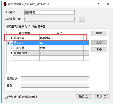 2、 数据规范中的自动编号,会默认增加一项“服务器字头”,用于区分是哪个服务器填报的。如果是发布者填报的则为空,如果是订阅者填报的,为“子服务器编号”(详见下面的设置步骤)。