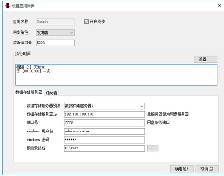指定Sample数据库为发布者,设置执行时间、数据存储服务器。