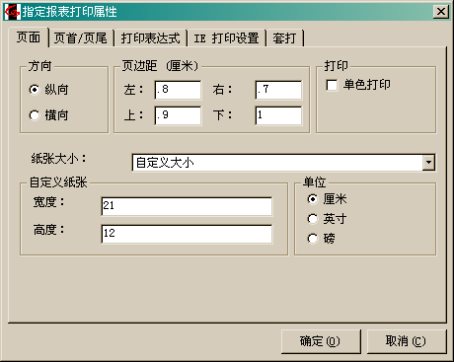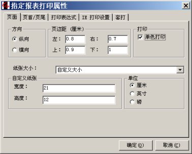 由于Excel本身的限制,如果需要设置自定义页大小,则除了在“指定报表打印属性”窗口中设置纸张大小之外,还需要同时在“Excel的页面设置”功能中设置纸张大小为“自定义”。例如,我们在“指定报表打印属性”窗口中设置了纸张大小,如下图所示:
