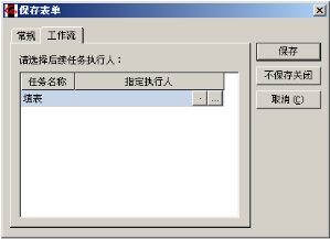 填报《员工调查表》,在空表格上什么也不用填,直接保存,弹出“保存报表对话框”,切换到“工作流”选项卡,如图,点击“填表”右侧的【
