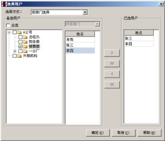 - 弹出“选择用户”对话框,选中销售部张三和李四,如下图所示,按【确定】。