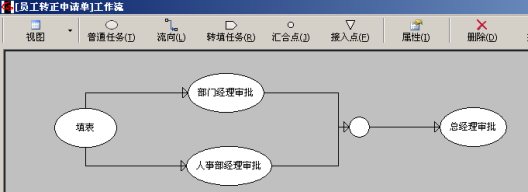 与之前接触过的工作流不同之处在于,该工作流程里多了一个“汇合点”(即流程图中的圆圈),汇合点的画法与“普通任务”一样,点击工作流窗口工具栏里的“汇合点”按钮,在画图区域单击,弹出“流程汇合点”对话框,输入任务名称并设置汇合条件,这里我们设置的汇合条件是:全部完成。