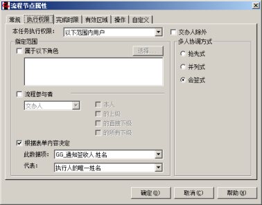 - 在任务的“执行权限”标签上,设置执行权限为“根据表单内容决定”,右侧的“多人协调方式”选择“会签式”。