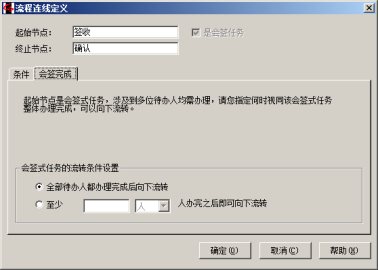 在会签式任务及其后续任务之间的流向定义窗口上,会多出来一个“会签完成”选项卡,用于设置会签完成向下流转的条件。如图,我们可以根据实际情况,规定只有所有会签的待办人都办理完成,此步才算完成,还是超过规定人数办理完成就可视同会签完成。