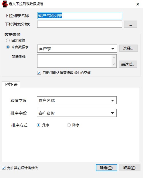 4.当选择了数据表表名后,该表中的字段或出现在“下拉取值字段”和“排序字段”两个下拉列表中,本例中,我们设置下拉取值字段和排序字段都是“客户名称”,排序方式为“升序”。