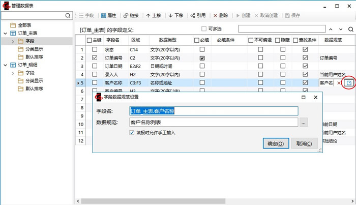 6.回到设计栏目,在“功能模块”中找到《订单》模板,调出其“管理数据表”窗口,设置“订单_主表”中“客户名称”字段的数据规范是“客户名称列表”。